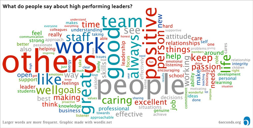 In both cases, the biggest word is “others,” suggesting a people-focus, but note the other words in blue. For high performing leaders, “others” is associated with effective work, then feelings and needs. For the highest performers, “others” is associated primarily with caring about people and clients. This is the essence of “people-leadership” — the blend of empathy and performance.