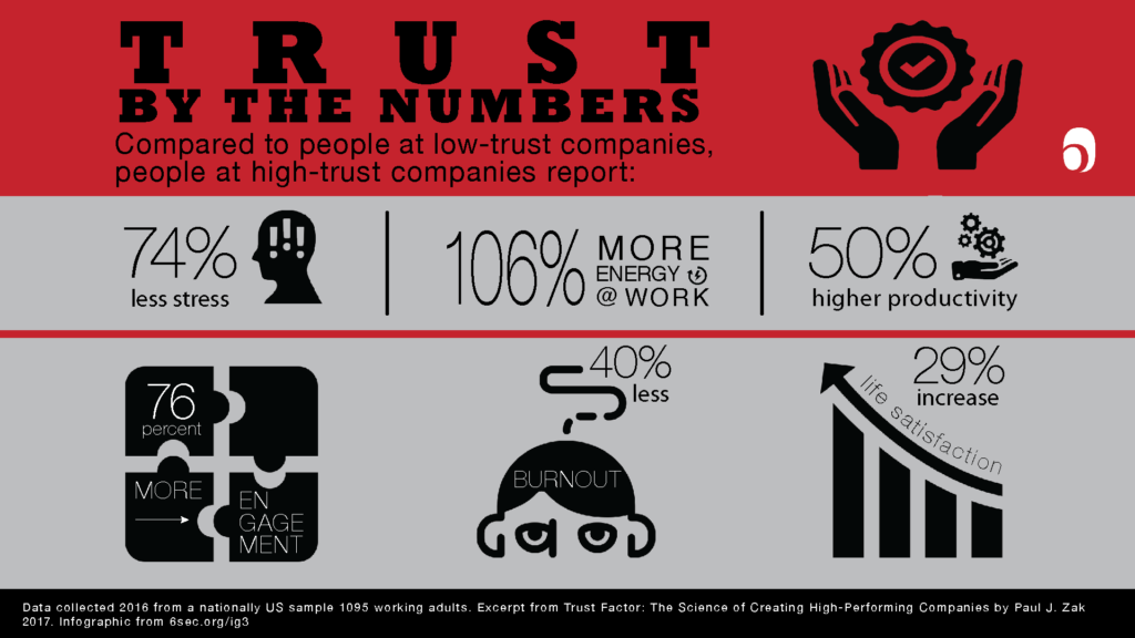 The 2017 Organizational Vitality study showed trust is simultaneously the lowest-scoring factor we measured in 95 countries — and the most valuable. As shown in this trust infographic, in high trust companies, employees are 50% more productive and have 40% less burnout. Here are more stats from Zak’s research: