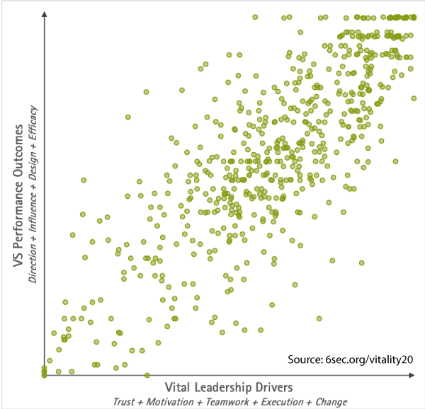 We combined these four KPIs into an overall variable called “Leadership Performance.” Likewise, the five drivers (Trust, Motivation, Change, Teamwork, Execution) we combined into a single variable called “Leadership Vitality.”