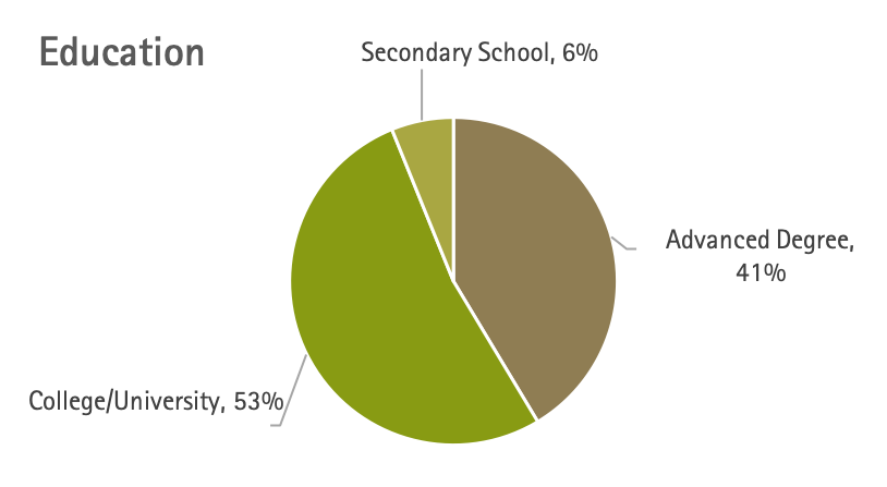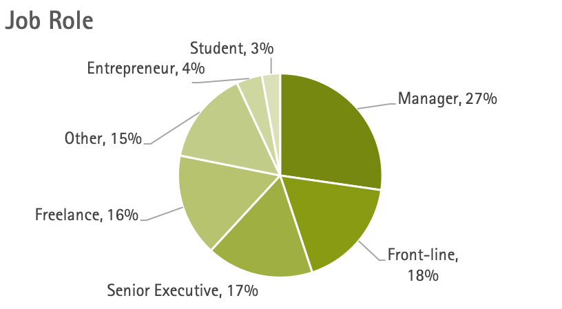 This phase of the Workplace Vitality study includes 1325 people who completed the surveys (described above), from 70 countries. Participants were recruited by email and social media to voluntarily complete the three questionnaires after reading the informed consent to participate. Of the responses, 610 were fully completed and statistically reliable. In addition to global diversity, the participants span a range of education and career backgrounds as shown in the graphs below.
