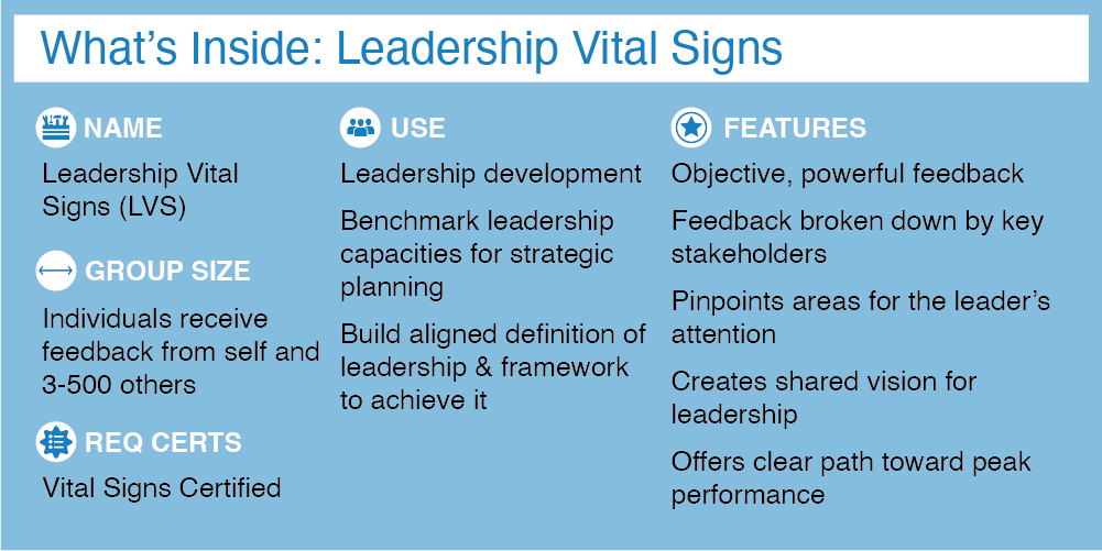 For your clients: As a professional working to develop leadership capacity, add the VS toolbox to your practice for a reliable, practical, simple-yet-profound approach. Earn Vital Signs certification through: