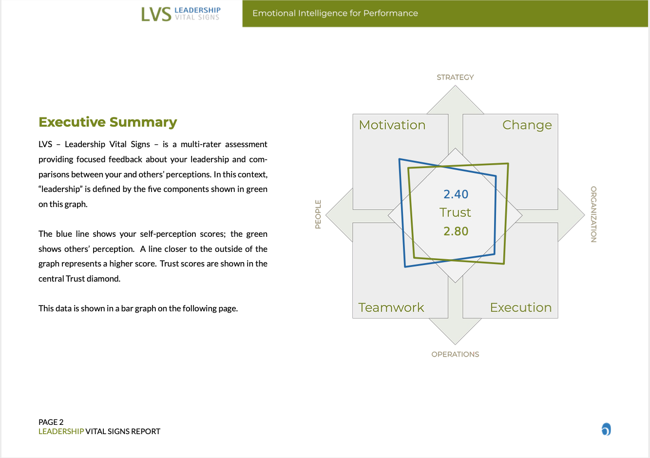 The LVS provides a snapshot of your current leadership performance based on your own and others’ ratings in 5 key areas: Motivation, Teamwork, Execution, Change and Trust.